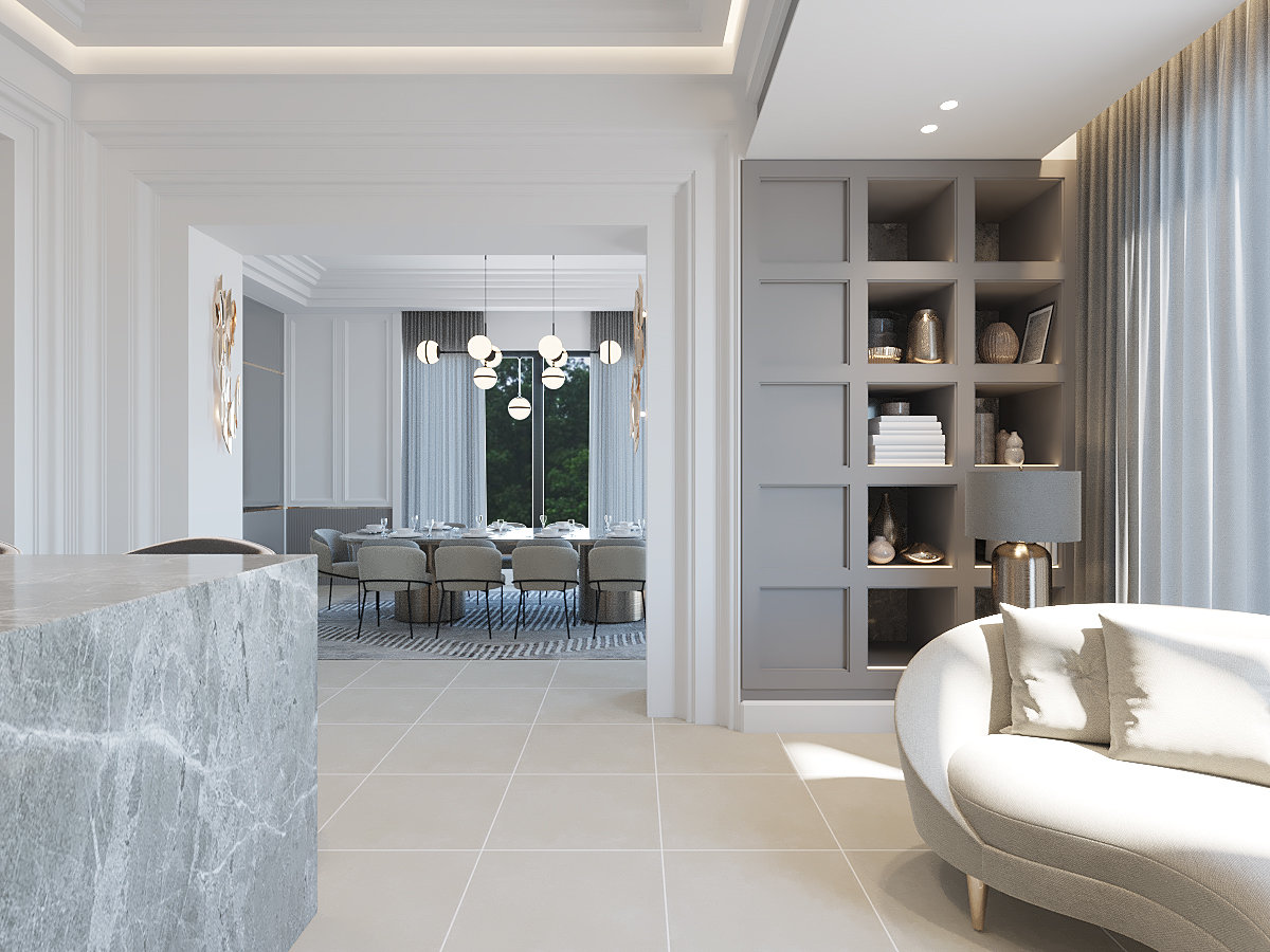 The balance and the harmonic elegance of this style is evident in every element, bestowing a noble and somewhat lavish feel to space. Decorative ceiling and wall moldings provide a rich texture, as well as arched walkways adding to the stately elegance of the style.